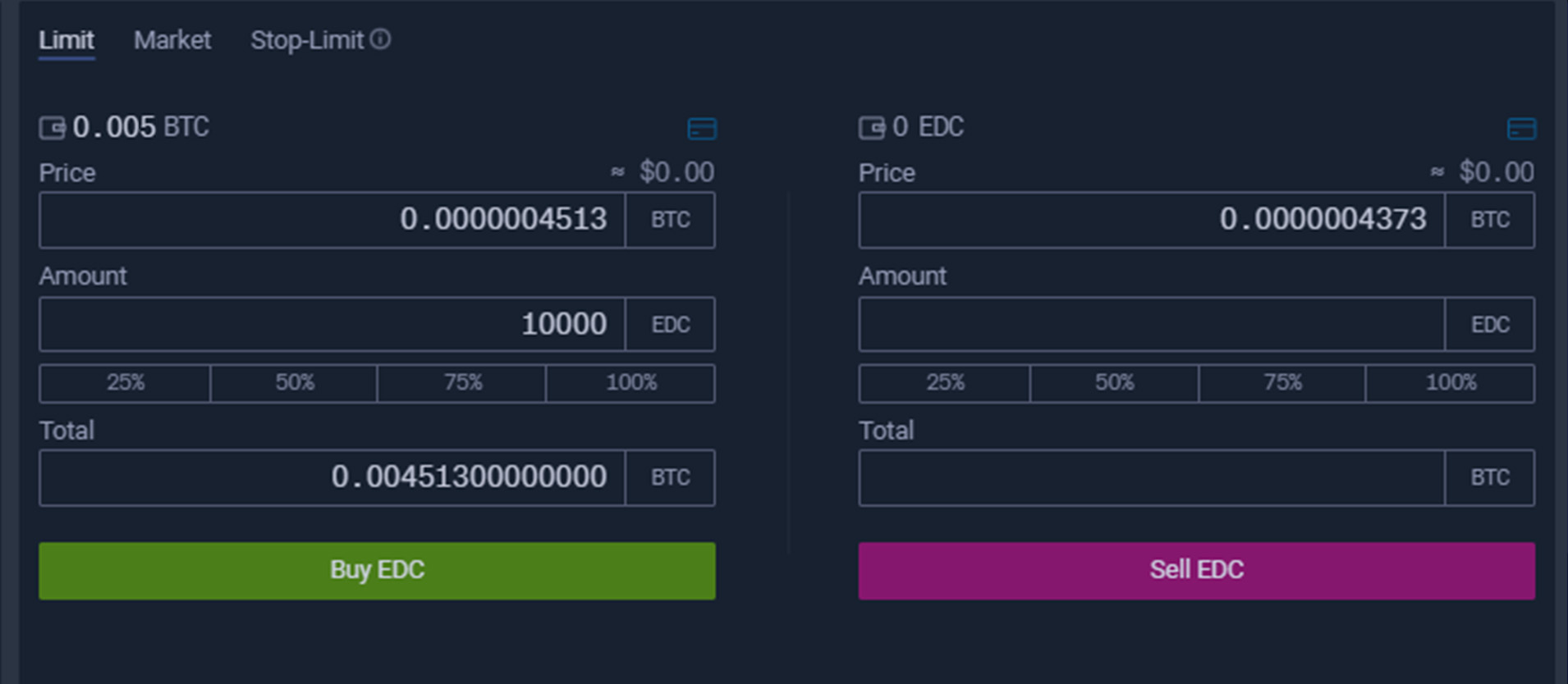 Далее, в правом нижем углу, в окне торговли в строке “Amount” вводим желаемую сумму покупки. Можно также установить цену, но для более быстрой покупки лучше её не менять. После чего нажимаем зеленую кнопку “Buy EDC”.