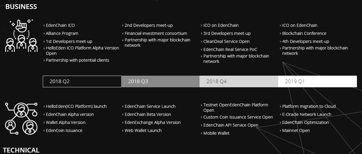 HelloEden - HelloEden sẽ là người đầu tiên triển khai EdenChain trong quý 2 năm 2018 và chủ yếu nhắm vào thị trường Hàn Quốc. EdenChain sẽ cung cấp dịch vụ phát hành đồng xu, tiếp thị và đầu tư ICO, một dịch vụ tổng thể dựa trên nền tảng.