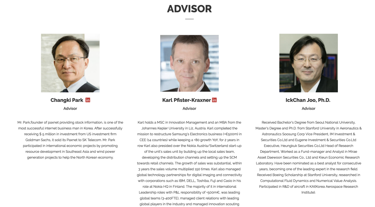 Đội ngũ advisor rất đông đảo (trong website họ đưa ra 10 người) trong đó nhân vật Changki Park được biết đến như một doanh nhân nổi tiếng nhất trong lĩnh vực Internet tại Hàn Quốc người đứng đầu Paxnet dự án nhận được khoản đầu tư 5mil đô từ Goldman Sachs, và đã từng làm việc tại Samsung trong 14 năm.