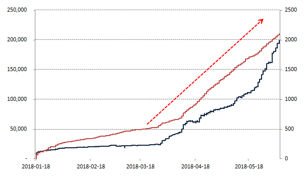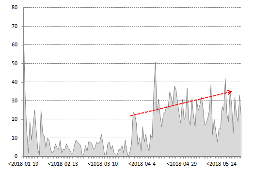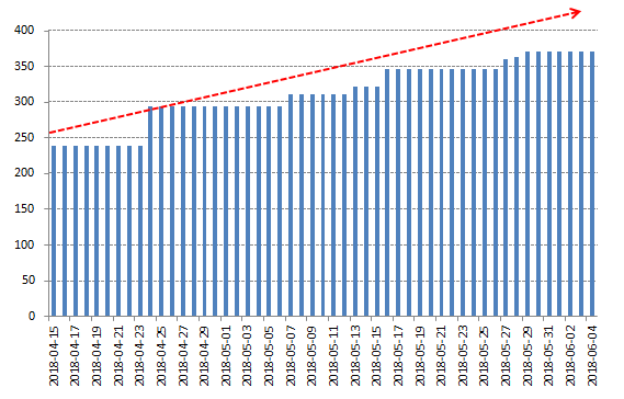 As can be seen above, the number of daily transactions is constantly maintaining 20-30 transactions per day.