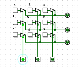 We received the design of a 3x3 size matrix keyboard excited by pins connected to each column of the keyboard respectively, once the column is excited, one of the three available buttons in that column can be selected, when more than one column is on at the same time, if a number is selected on the keyboard the circuit’s output will be invalid, then the circuit originally delivered: