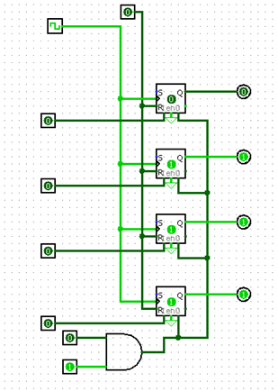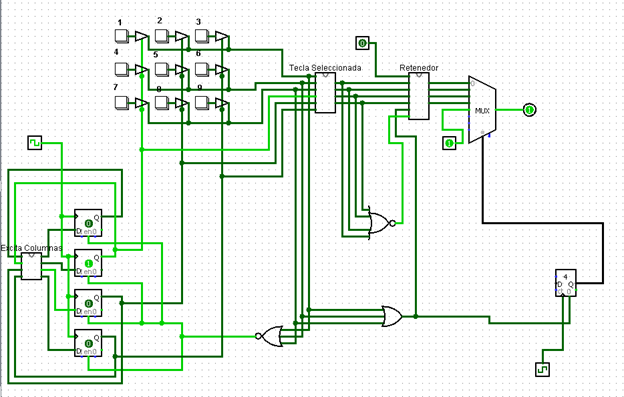 At the output of the circuit “Tecla seleccionada” there is another integrated circuit called “Retenedor”, it is composed of an arrangement of SR type flip flops, which are responsible for retaining the value that the circuit “Tecla Seleccionada” throws even when This flies to its idle state, in this way the binary encoding of the selected number on the keyboard is obtained at the output of the retaining circuit, remaining as follows.