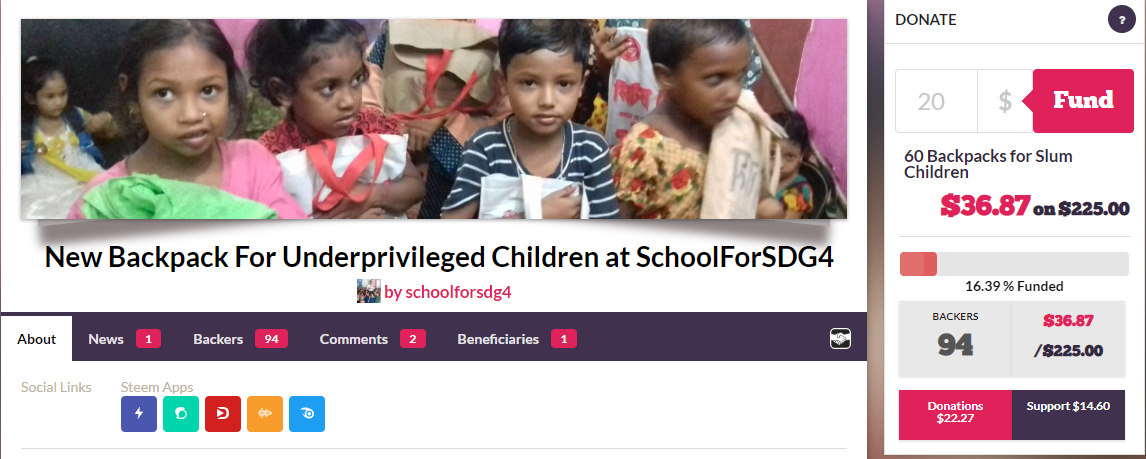 We would like to invite you to join us and allocate school backpacks for slum children in Bangladesh. It is for a long time we are fundraising for the cause and finally, I decided to arrange the school backpacks this week. So we need to withdraw some fund this week to make it happen. Thanks to @YouAreHope for the amazing contribution to the school backpacks fund. We received 400 Steem from the charitable giving project run by @sircork.