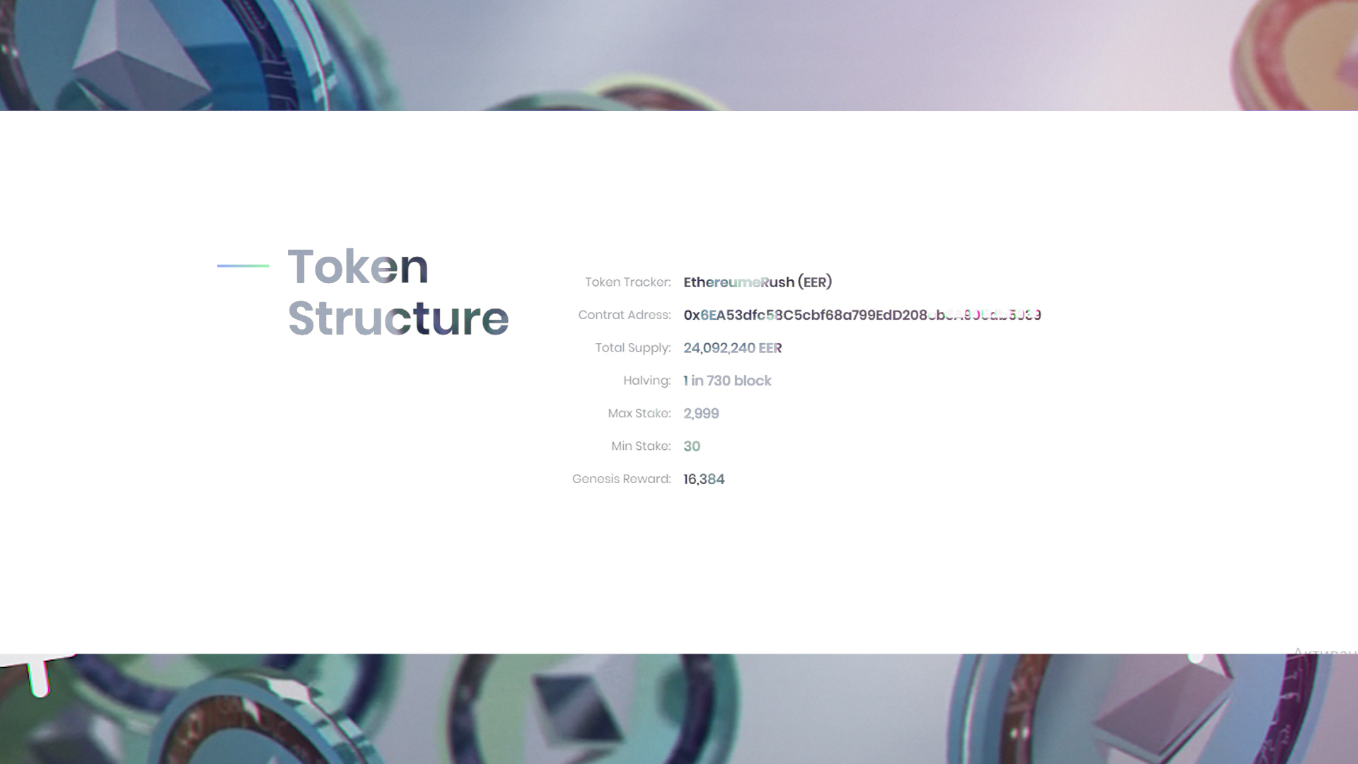 There is no need to worry about the exchange rate, because the developers have integrated a deflationary mechanism in their code, namely, the familiar halving, which reduces the reward of miners from every 730 blocks or approximately every 2 years. In total, it will be possible to mine 24,000,000 Ethereum eRush coins and currently the reward for miners for 1 mined block is approximately 16,000 EER tokens. Moreover, it is distributed evenly among all the miners who participated in mining of this block.