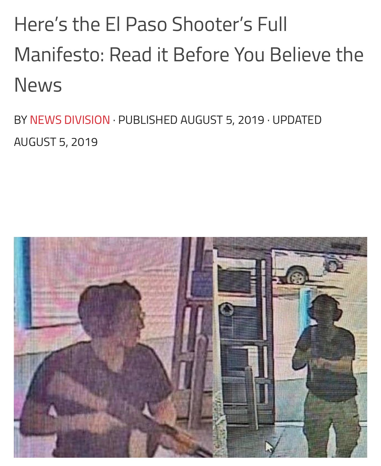 The past couple of days the media has been working in overdrive to push a narrative that Trump is responsible for the El Paso shooting. The only problem with that is the shooter explicitly states in his manifesto that he was not a Republican, nor did he express any admiration of our President.
