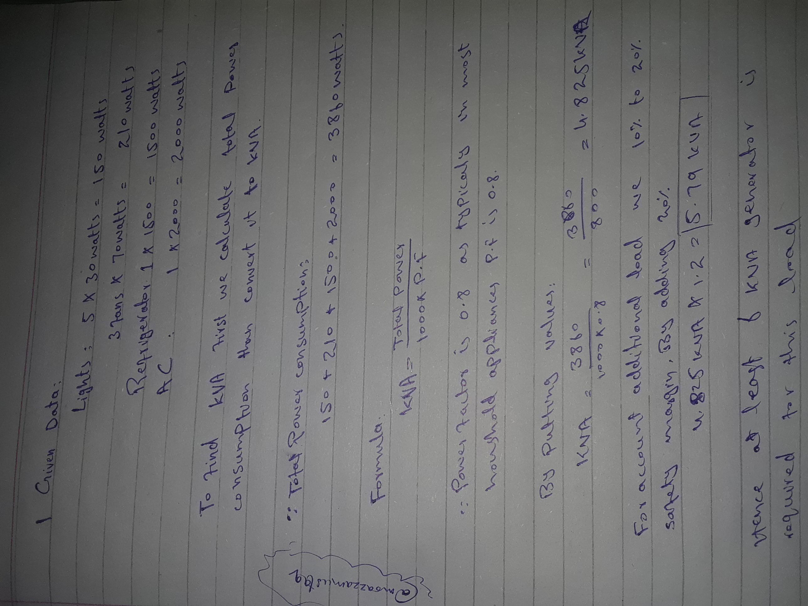 D. How much KVA generators should you buy for five 30-watt lights, three 70-watt fans, one 1500-watt refrigerator, and one 2000-watt air conditioner? |