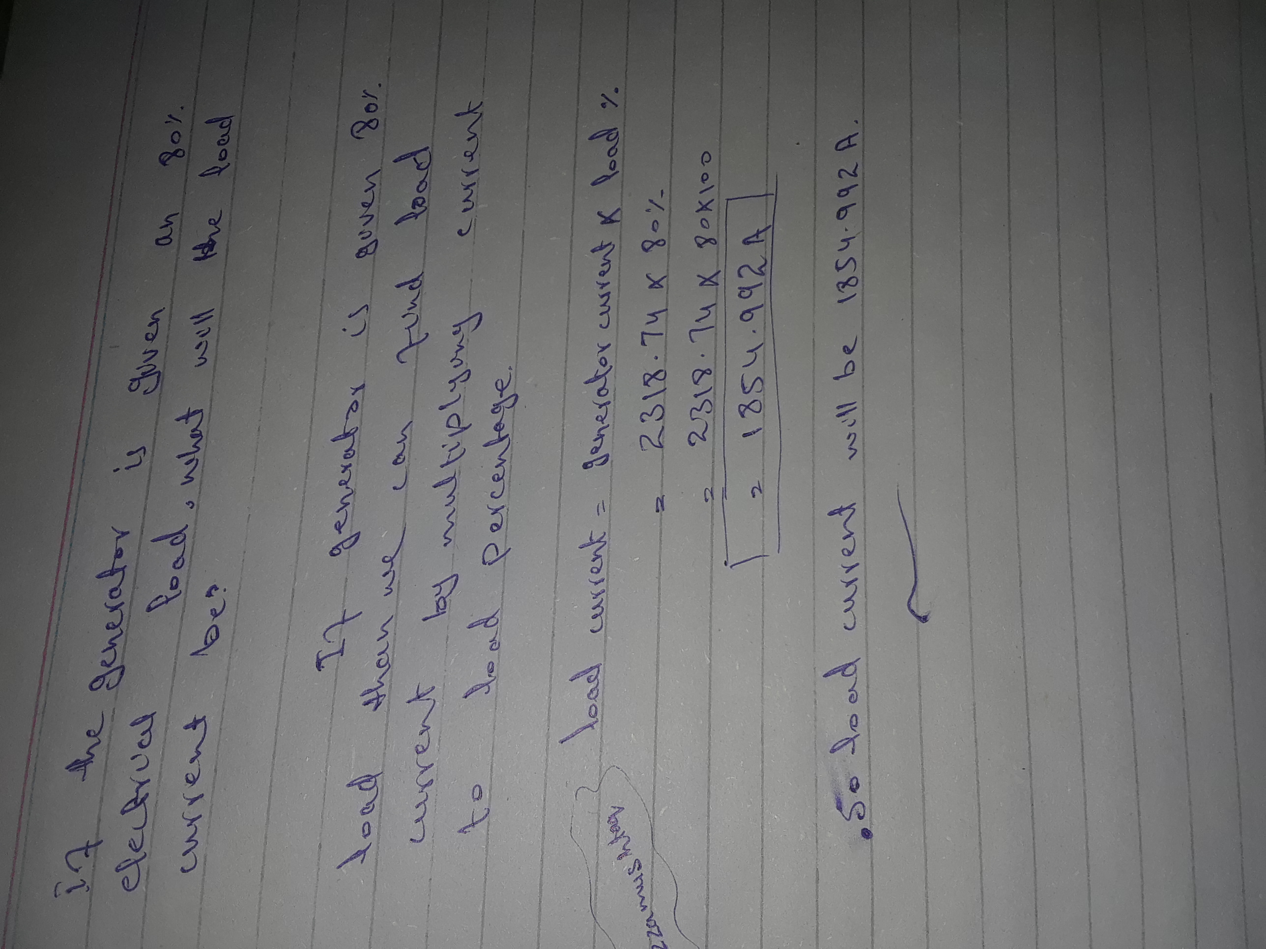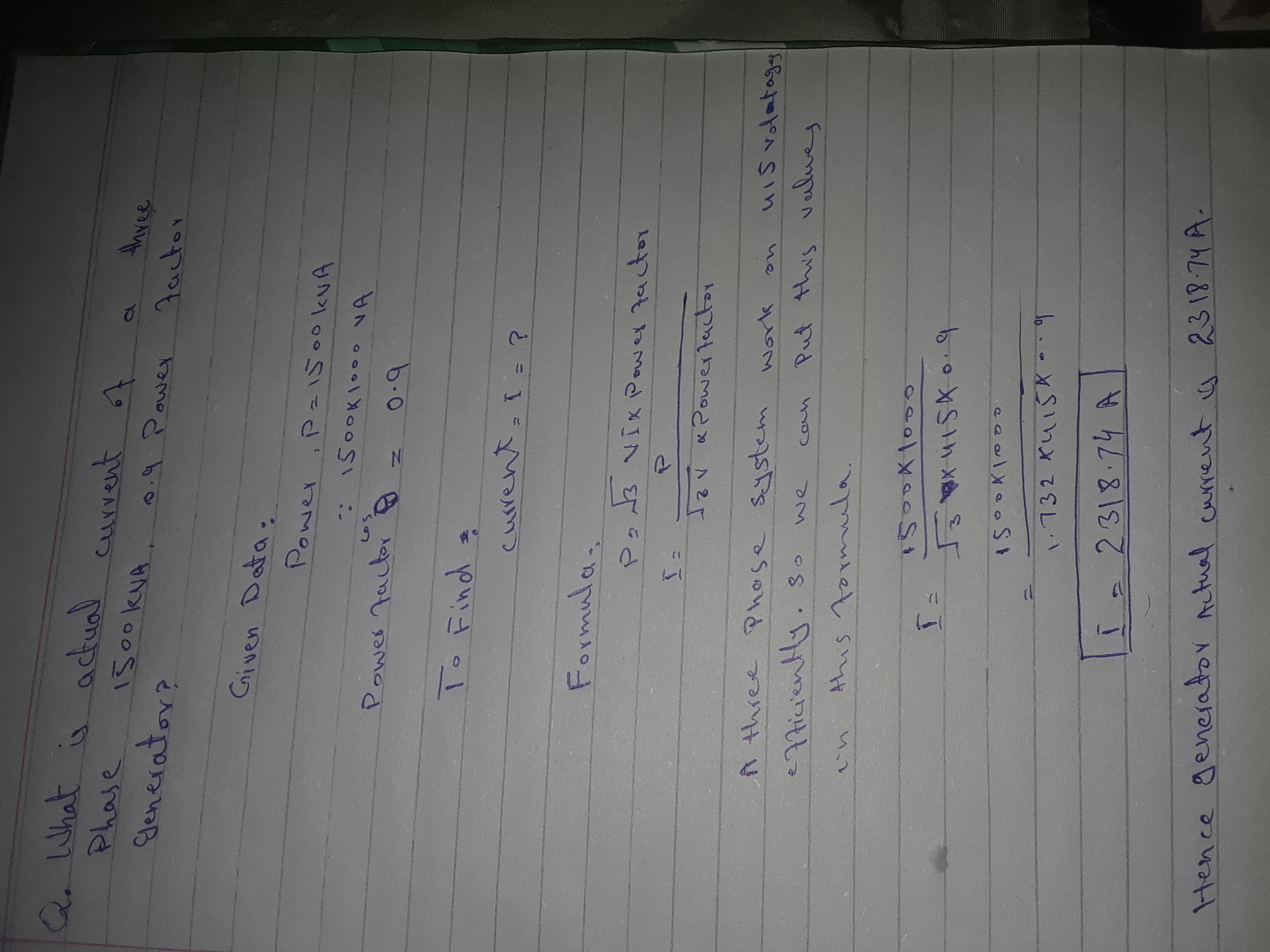 C. What is the actual current of a three-phase 1500 KVA, 0.9 power factor generator? |