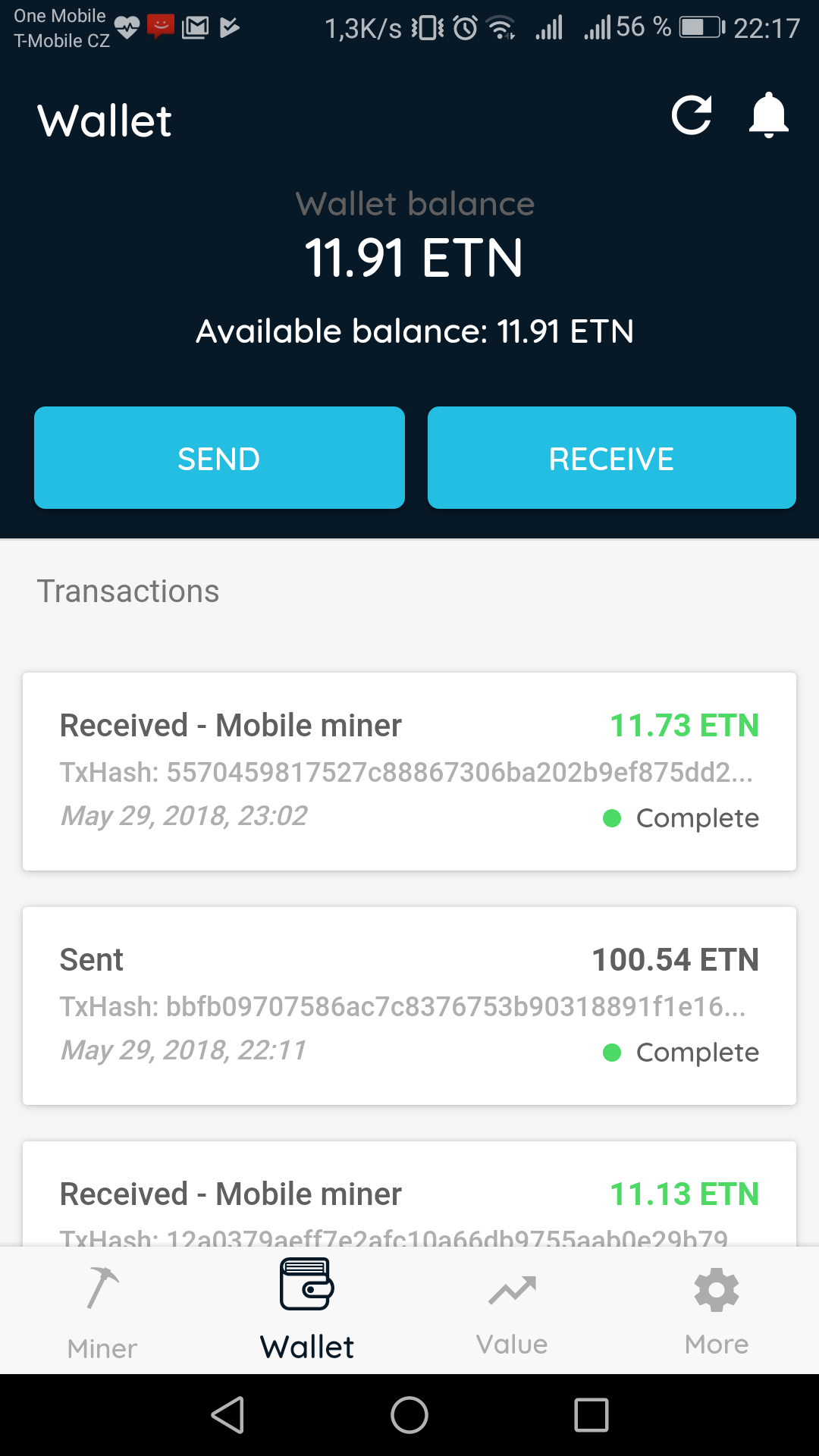 On the other hand, mining ETN means some work. At least you must turn on the app and sometimes check whether the app is running (it suddenly stops several times a day). Since April 2018 I've earned ETN worth 2.5USD (100.54+11.73+11.91ETN):