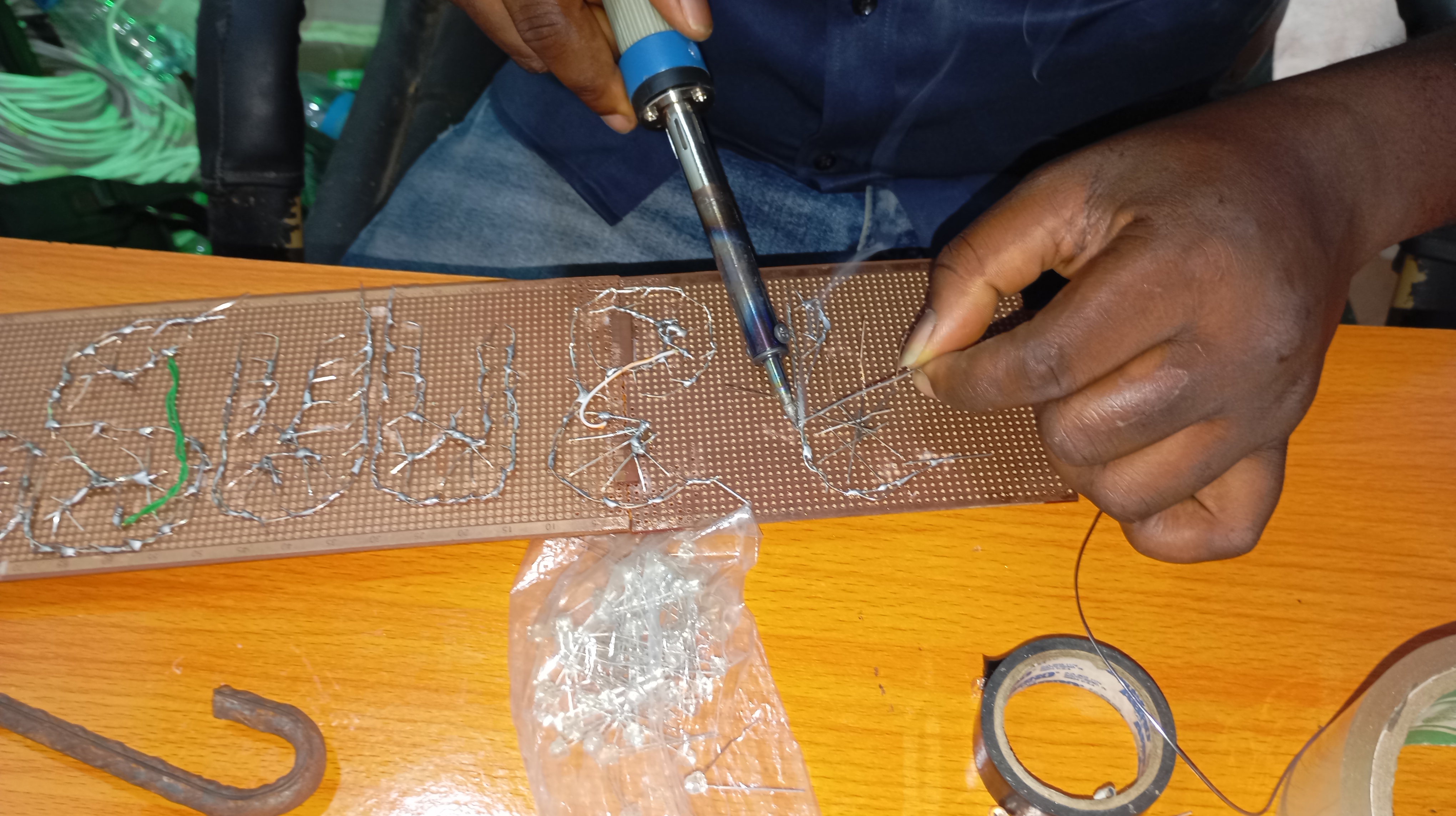 The process is simple. All the anodes of each letter are soldered together, while all the cathodes are soldered together separately as well. Note that at this point, you can first write the letter you want to form on the board and then place the LEDs following the letter drawing.