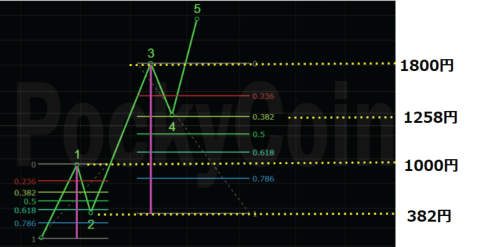 例えば第3波が1800円であった場合は、第2波からの上昇の高さは1800円マイナス382円でこれに0.382倍を掛け算すると542円と出ますので、1800円から542円を引き算すれば1258円という数字が出てきます。