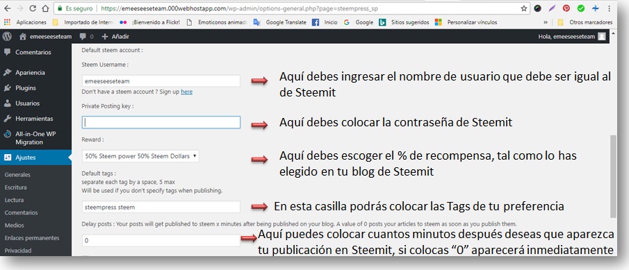 Ahora empezaremos a configurar WP, toma en cuenta que muchas casillas se parecerán a las que sueles llenar en Steemit, así que respira profundo y disfruta el proceso de aprendizaje, lee bien la explicación que hemos puesto al lado de cada una de ellas: