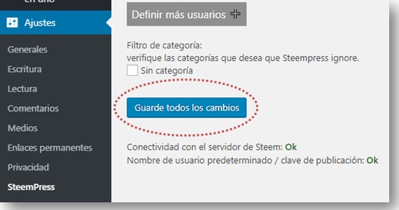 Una vez llenadas las casillas, haga clic en la franja azul "Guardar todos los cambios", ya con esto habrás terminado de configurar WP de acuerdo al plugin SteemPress.