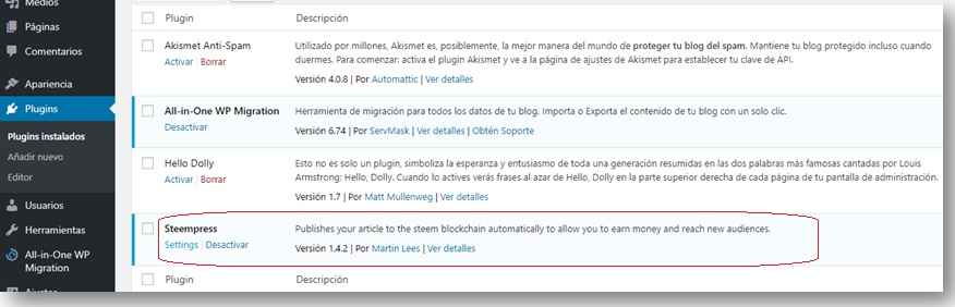 Cómo vez en el cuadrado rojo, SteemPress se encuentra en la bandeja de plugins descargados.