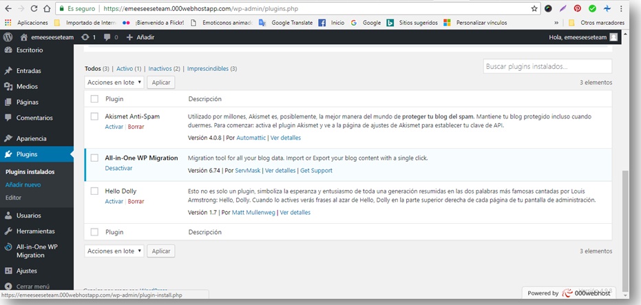 Tal como lo muestra la siguiente imagen, Wordpress trae 3 plugins, de los cuales 1 sólo se encuentra activado: puedes ver que sus nombres son: Akismet Anti-Spam, All-in-one WP Migration y Hello Dolly, cada uno para un fin diferente, tal como lo explica la breve descripción que se encuentra al lado de su nombre, también puedes verificar la versión de cada uno de ellos.