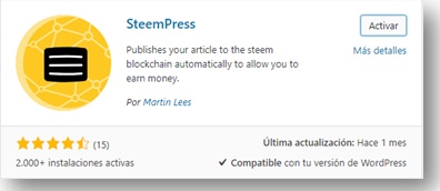 Ten en consideración que puedes hacer la búsqueda del plugin de tu preferencia, tantos como desees y necesites, uno de los plugins más conocidos en estos momentos es SteemPress, si es tu intención descargarlo puedes ubicarlo en la casilla que está bordeada por la figura puntuada de rojo:
