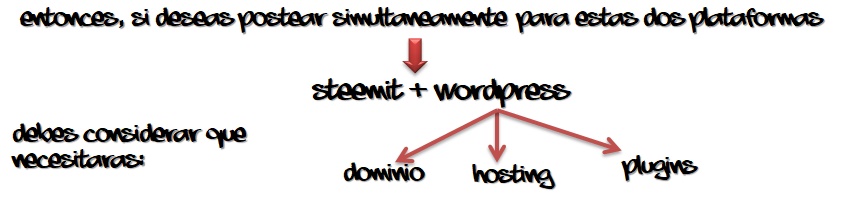 Entonces tenemos que para desenvolvernos en Wordpress debemos tener un nombre (dominio), en un hosting y descargar distintos plugins, no sólo para hacernos de varias herramientas diferentes sino para que nos permitan conectar los post que hagamos en WP con la plataforma Steemit.