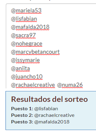 1Para quien no lo conoce, es un sistema automatizado en el que se colocan los nombres de los participantes, y el sistema por si solo en orden aleatorio se encarga de escoger los ganadores.
