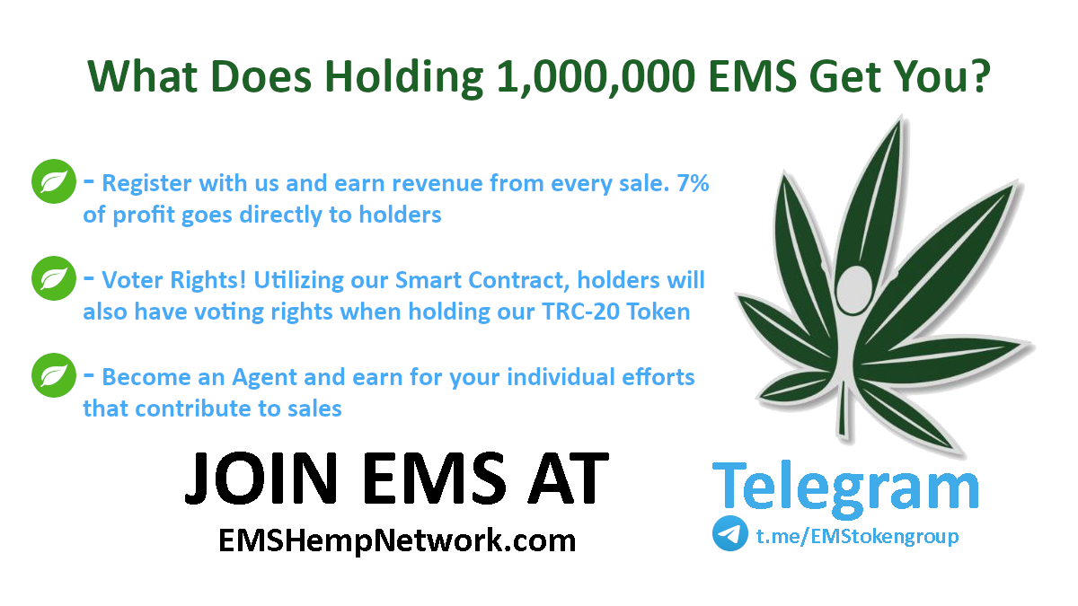 If you wish to join EMS on our journey and become a member and HODL one of the best tokens in the upcoming CBD industry then please contact us via our socials. Our staff will be more than happy to assist you.