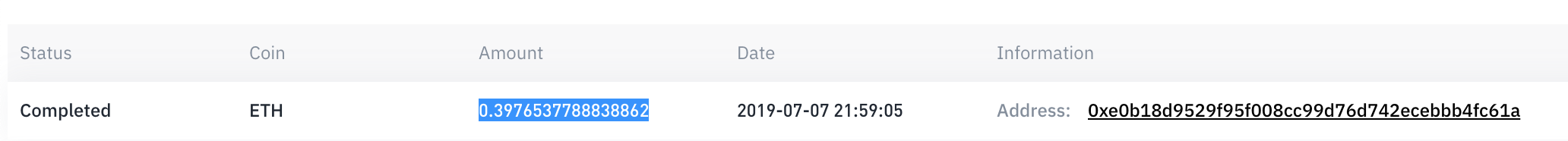 When transferred to Binance this gave us 0.4 eth which at the time was €120