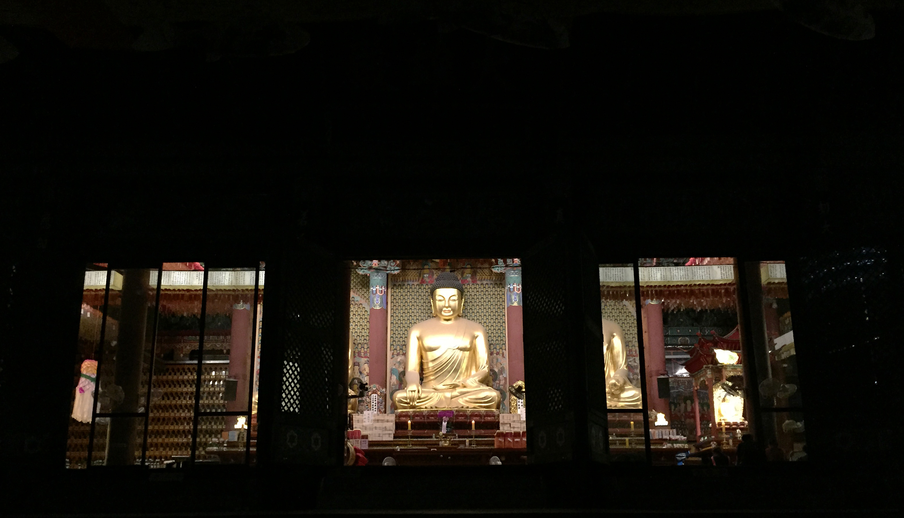 절에 고요히 앉아있는 부처님상 세개가