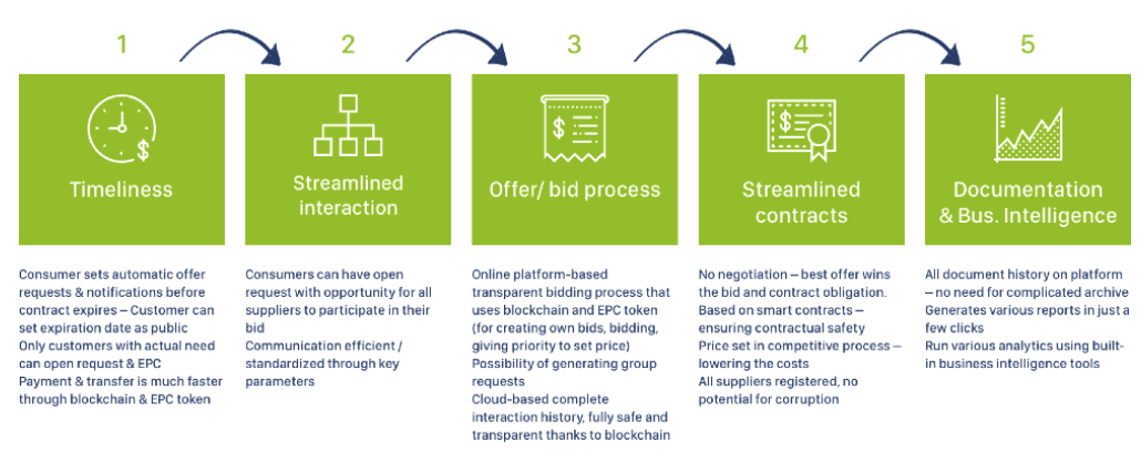 Moreover, the usage of this technology allows Energy Premier to help to the suppliers and consumers to automatically conclude contracts in easy and safe way and these contracts cannot be changed by another user, and brings flexibility and transparency making the platform trustworthy and reliable.