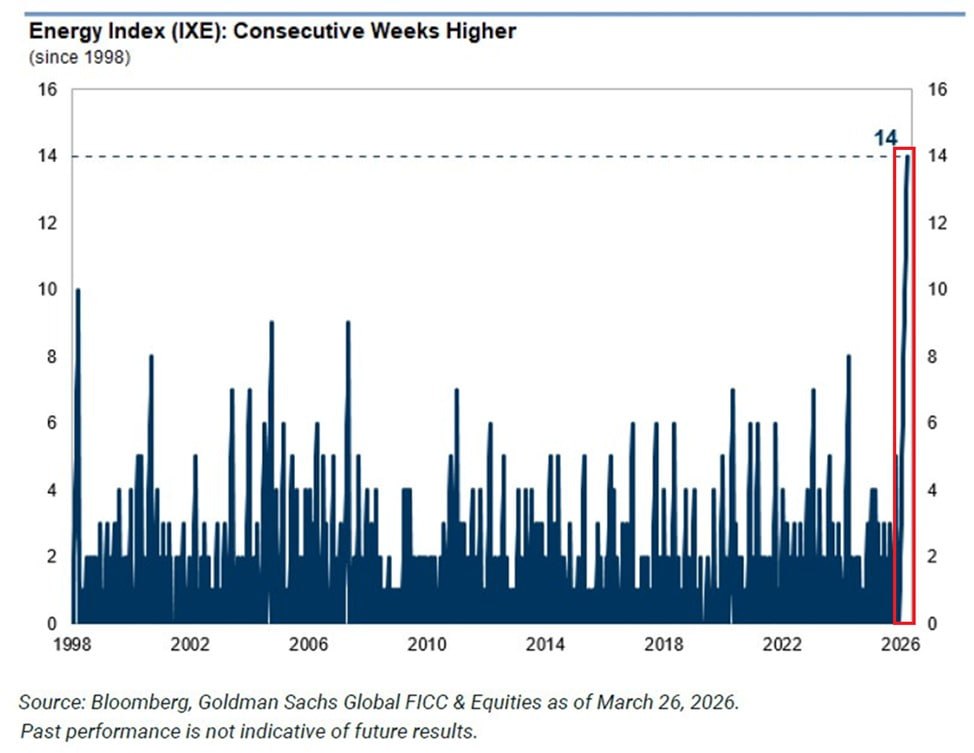 The US Energy Select Sector Index has gained for 14 consecutive weeks, the longest streak on record.