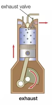 ৪/ নির্গমণ ঘাত: এই ঘাতে গ্রহণ ভালভ বন্ধ এবং নির্গমণ ভালভ খোলা থাক। পিস্টন নিচ থেকে উপরের উঠে। এবং সকল পোড়া গ্যাস বাইরে বার করে দেয়। এই ঘাত শেষে ক্র্যাকশ্যাফট মোট ৭২০* ঘুর্ণন সম্পূর্ণ করে। এর পরে আবার প্রথম থেকে ঘাত শুরু হয়। এই ভাবে ইন্জিন চলতে থাকে।