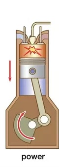৩/ শক্তিঘাত: এই ঘাতে দুইটি ভালভই বন্ধ থাকে। এই ঘাতে সিলিন্ডারে স্পার্কিং হয়ে (পেট্রোল ইন্জিনে) উচ্চ চাপে জ্বালানী স্প্রে হয়ে (ডিজেল ইন্জিনে)দহন ক্রিয়া সম্পূর্ণ করে শক্তি উৎপন্ন করে। এবং পিস্টনকে নিচের দিকে ধাক্কা দেয়। তাই পিস্টন উপর থেকে নিচের দিকে নামে। শুধু এই ঘাতে শক্তি উৎপন্ন হয় বাকি ঘাত গুলোকে চালাই। তাই একে শক্তি ঘাত এবং বাকি গুলোকে অলস ঘাত বলে। এই ঘাত শেষে ক্র্যাকশ্যাফট মোট ৫৪০* ঘুর্ণন সম্পূর্ণ করে।