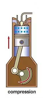 ২/ সংকোচন ঘাত: এই ঘাতে দুইটি ভালভই বন্ধ থাকে। পিস্টন নিচের থেকে উপরের দিকে উঠে। এই ঘাতে সিরিল্ডারের ভিতরে তাপ ও চাপ উৎপন্ন হয়। ক্র্যাকশ্যাফট মোট ৩৬০* ঘুর্ণন সম্পূর্ণ করে।