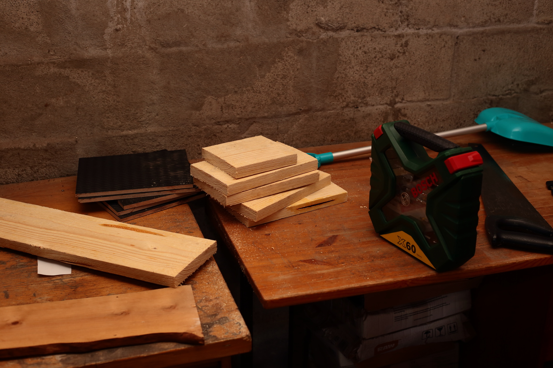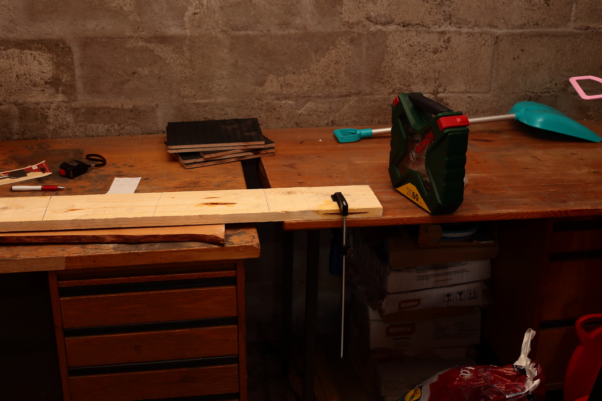 As a proper husband, I decided to work in our garage. I didn't have much space there and the best place to work on was the two tables (which are a bit in different heights) as I could saw between them. I had to place an another board on the table on left so the board I'm cutting is in correct height.
