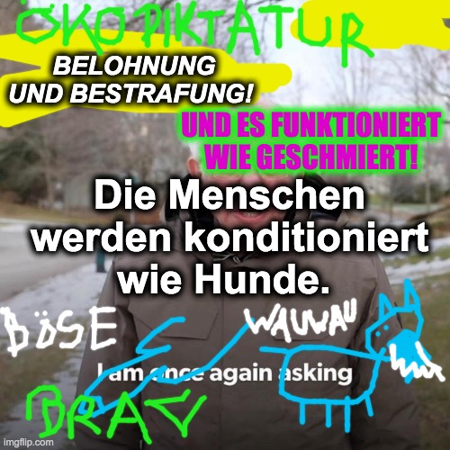 Du kennst nur deine Daseinsform als Zirkusnummer und hüpfst so hoch wie ich es dir befehle. Du hast dein kleines dummes Sklavenleben auswendig gelernt um mir zu gefallen. Die Indoktrination machte dich zum Zirkuspferd und du weißt nicht einmal warum. So glaubt dein geistig beschränkter HammelHerdenHorizont wenn nur genug Anstrengung dein Dasein rafft, das Zuckerbrot dich ins Paradies schafft. Es ist die Lebenslüge des Sklaven, der nicht glaubt ein Sklave zu sein. So wird er verwertet bis nichts von ihm übrig bleibt außer seiner LebensArbeitszeit und seines Gedankenmülls.