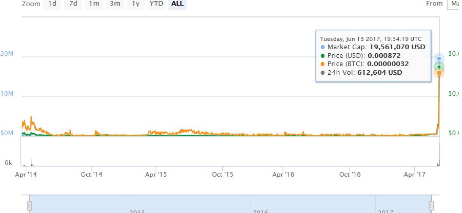 2.- Iota, is the surprise of the day today June 13, 2017, its chart still does not show movements because it has started to quote with a price of 23,108 satoshis. Wow, go! Nothing bad!!! True??