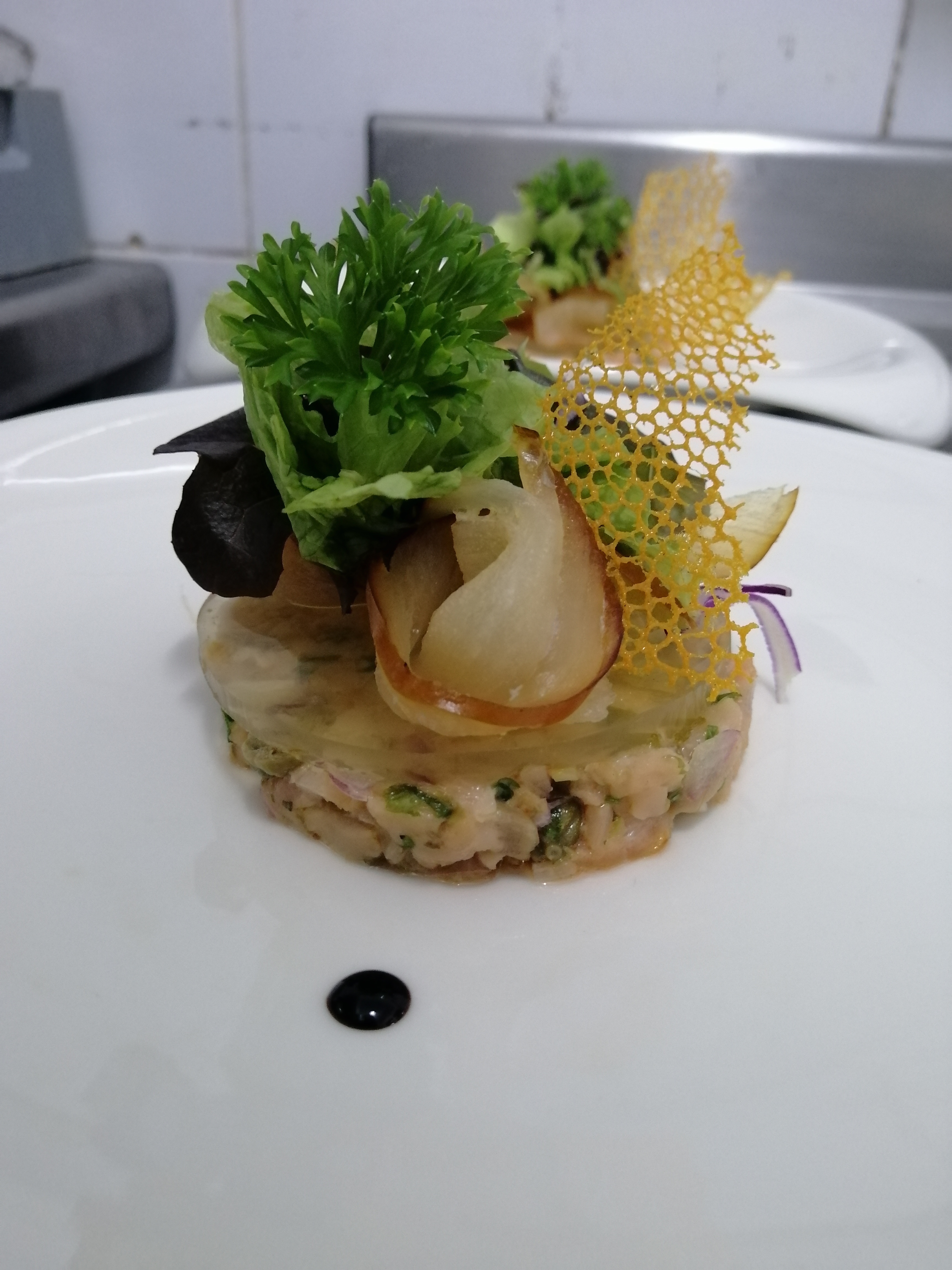 #foodiesyogesh2919 (40)in #enjoy • 6 years ago Combava jelly sitting on a smokey salmon tartar acc herbs salad and garnished with a coral tuile
