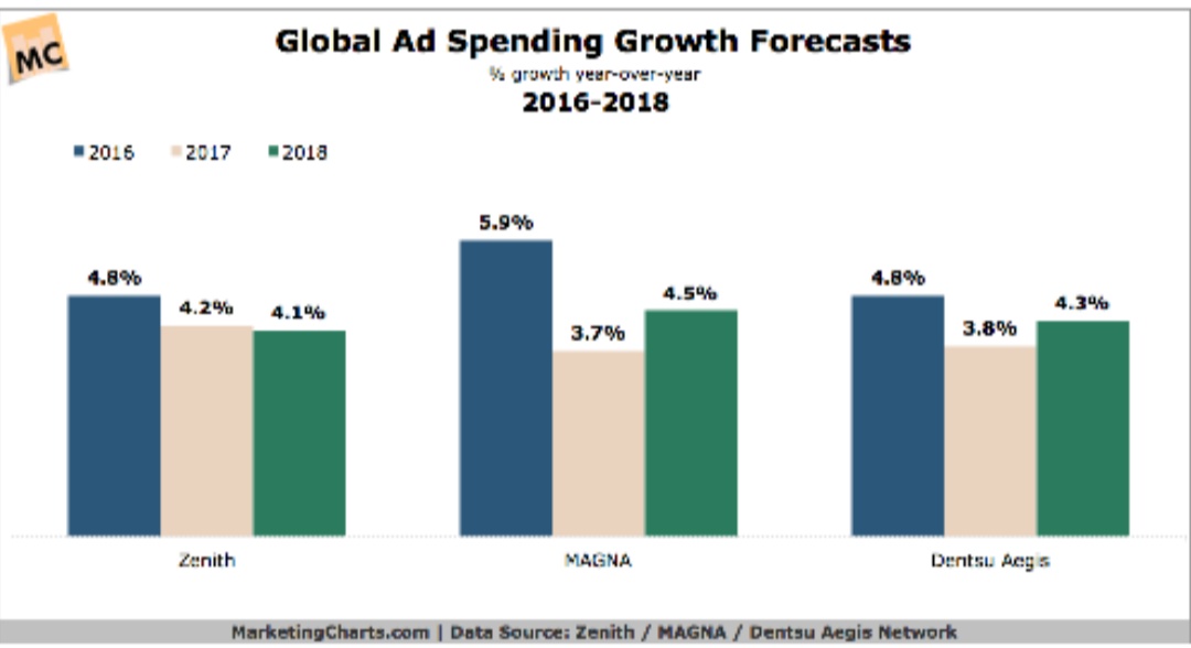 Global ads spending forecasted by Zenith, MAGNA [pdf] and Dentsu Aegis Network showed the following results.