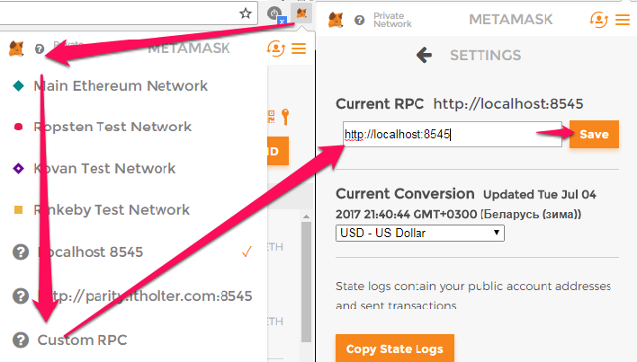 Add your parity client to Metamask Custom RPC: