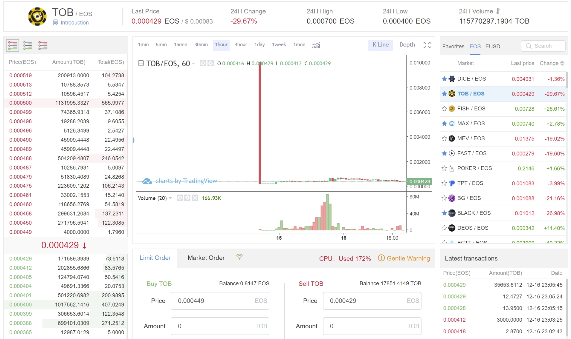 최근 2,3일 사이에 거래량이 폭증했던 원인은 몇몇 고래들이 배팅을 많이 했기 때문인데, 그 고래들 지갑에 가보니 뉴덱스에서 EOS로 다 바꿔먹고 TOB 토큰 수량 잔량이 0개였다. => 즉, 한번씩 다 털어먹고 나갔다는 것.