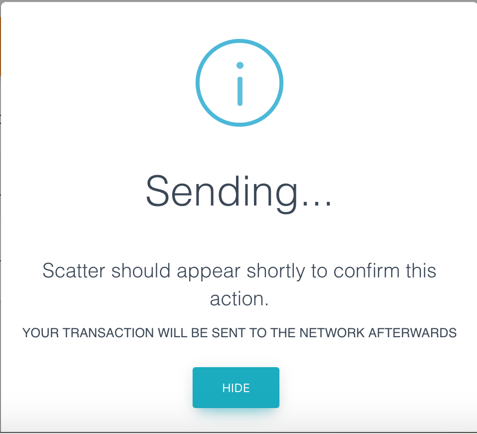 As usual, an additional Scatter window will appear asking you to verify the transaction, followed by another dialogue indicating that the transaction was successfully verified. (Since you will most likely know the procedure, I have not added screenshots here.