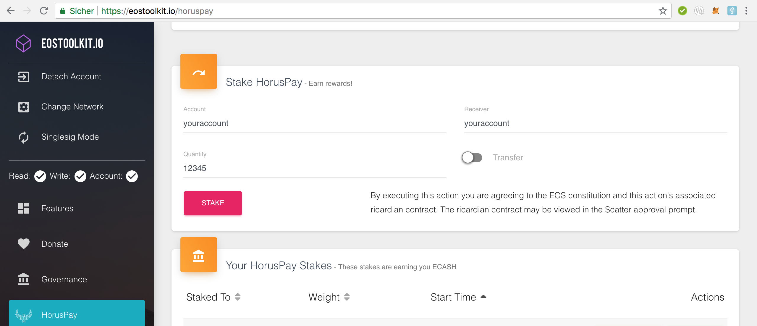 Since some days staking of HorusPay tokens is available to you via our friends of GENEREOS. A new function is now available for HorusPay that gives you control over staking and claiming of your rewards. The following link directs you to the website: EOSTOOLKIT HorusPay.