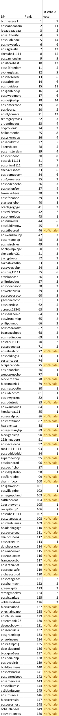 There has been a major shake up after the date of this article. Bitfinex has now spread their vote over multiple BPs and now the rankings are much different