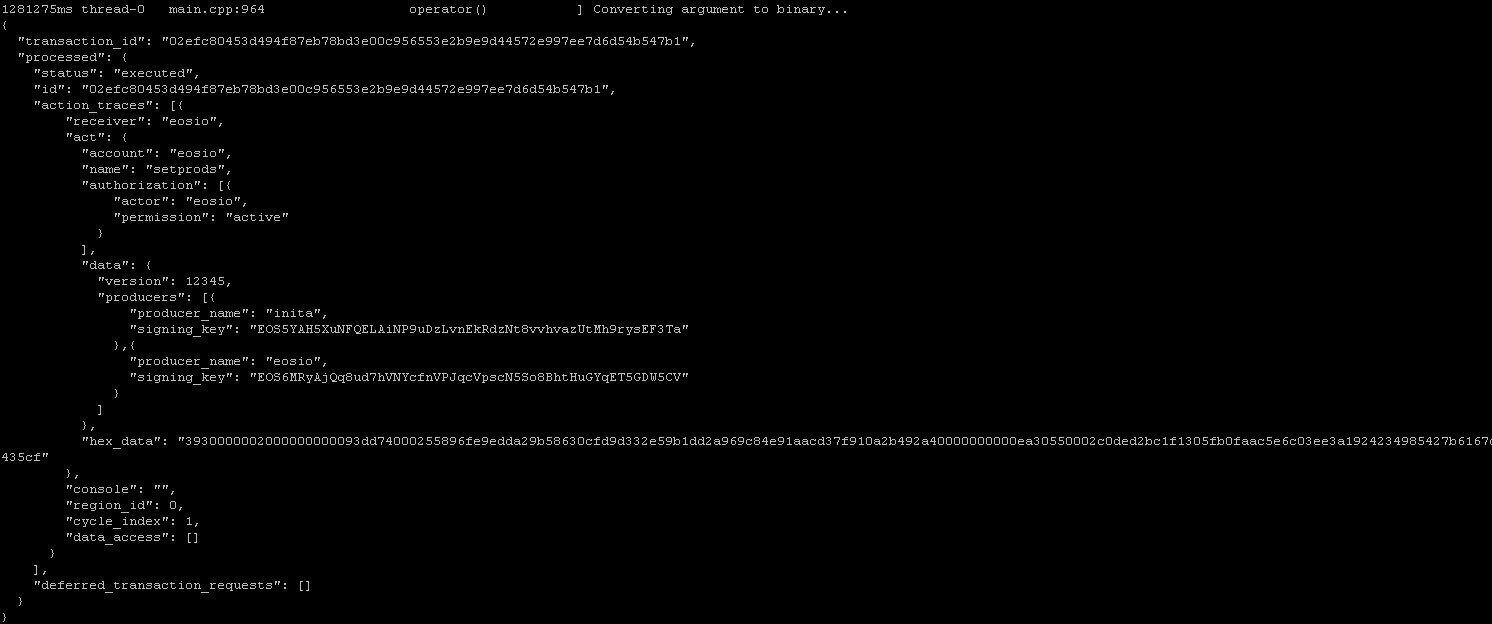 # programs/cleos -p 8888 --wallet-port 8888 push action eosio setprods "$(cat setbp.json)" -p eosio@active