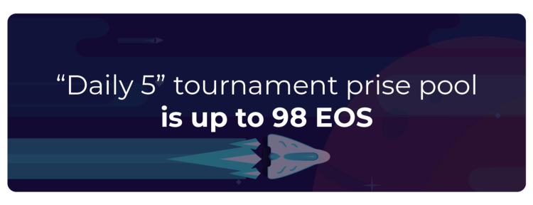 “ Daily 5 " tournament — its usual variation of conquest with compulsory buy-in of 5 EOS. 98% of Buy-ins will go to the Prize pool. As you understand Prize pool in the “Daily 5” Tournament will be significantly bigger than in Free Roll. If there is maximum amount of players, Prize pool is 98 EOS. Sounds nice, isn`t it?!