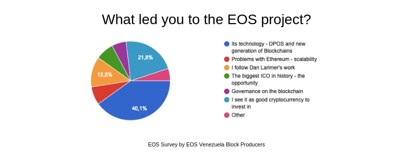 According to the survey, the three keys that brought users to the EOS project is mainly its technology, a new kind of upgraded blockchain to its time. The following key with 21% is the economic attractive of the token as an investment. And the third key highlighted on the survey is the follow up to Dan Larimer's work, a hard 12% fan base of BlockOne CTO.