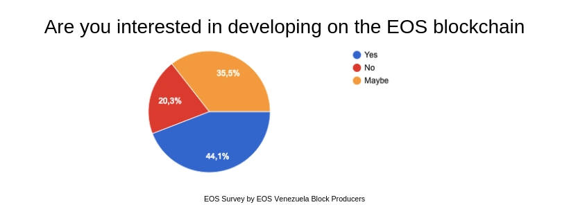 About 30% of our community are developers, which is good when you think we are a dApp-focused chain. From these developers its only 44% are actually working on some development, and from the rest, about 35% is slightly inclined to start something. A small 20% declared that are not interested into building something on the EOS platform.