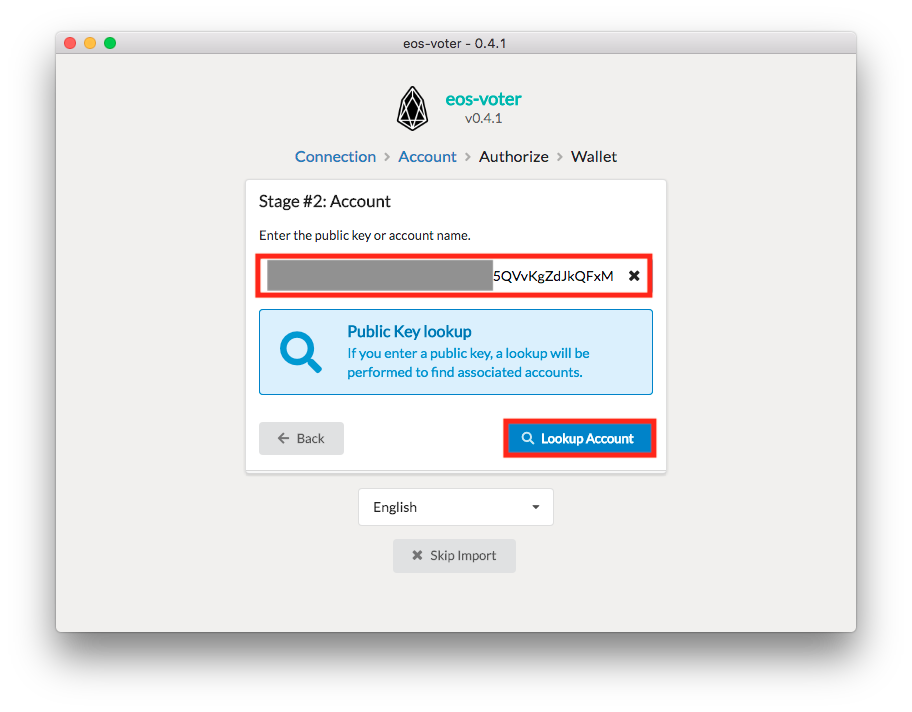 Remember that public key we had you copy earlier? Now's the time to use it - paste your Exodus EOS public key into the Enter the public key or account name field. Once that's done, select Lookup Account: