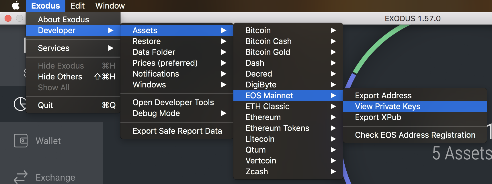 Using the Exodus Developer Menu, go ahead and view your EOS mainnet keys: