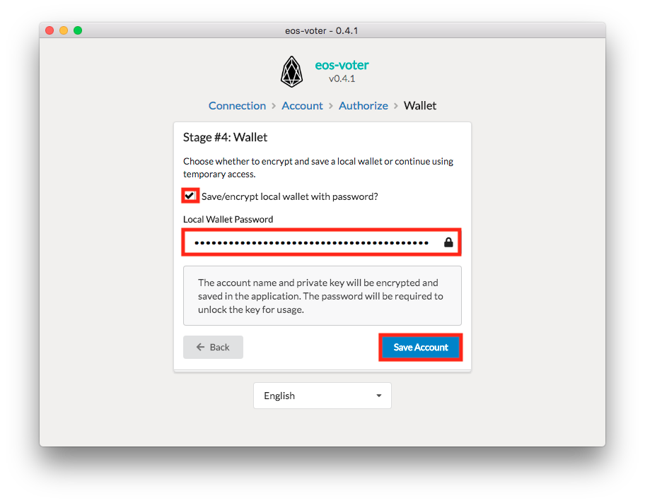 Go ahead and click on the Save/encrypt local wallet with password check box and set a strong, unique Local Wallet Password to keep your funds safe. With all that done, click on the Save Account button: