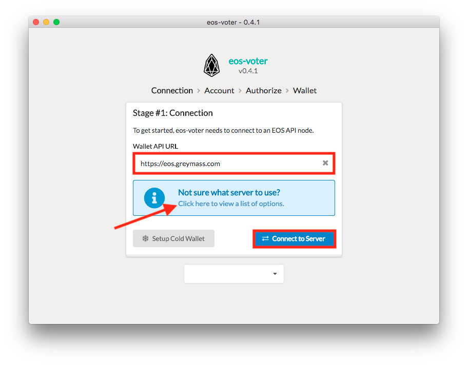 Once you have Greymass installed, open it up and take a look at the Welcome Page. It's here that you'll select a server from a list of possible nodes. Select the Click here to view a list of options tab to proceed - we chose https://eos.greymass.com for our purposes, but you are free to select whatever node you prefer.