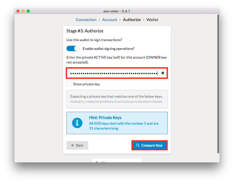 It's now time to hop back over to your Exodus wallet and copy down your EOS mainnet private key. Please check out the screenshot in Step 2 for how to do so. Once you have this key, you can paste it into the EOS-Voter Private Active Key (WIF) field. Then click the Compare Keys button to proceed: