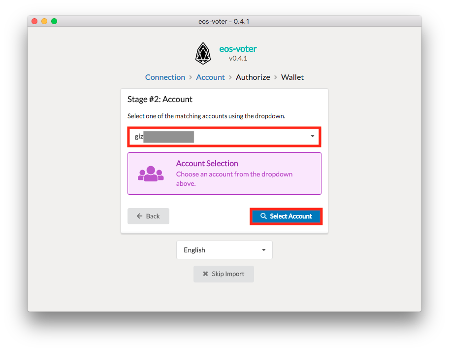 At this point, you should be able to select your associated EOS account from the drop-down menu - then click the Select Account option to proceed: