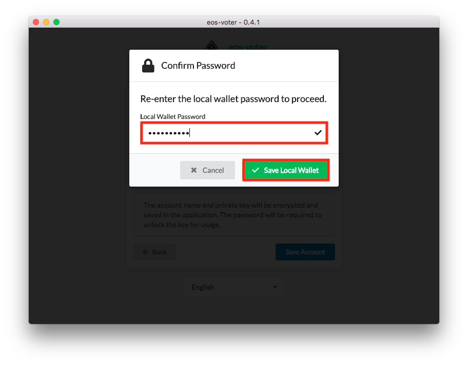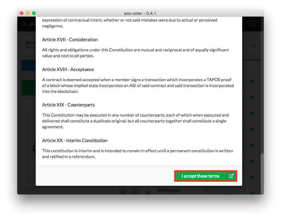 Now you'll have to confirm your fancy new password - go ahead and test it out by re-typing it into the EOS-Voter wallet and then select the green Save Local Wallet button:One of EOS's distinguishing feature is its Constitution - you'll have to agree to these terms before you can use your EOS-Voter wallet: